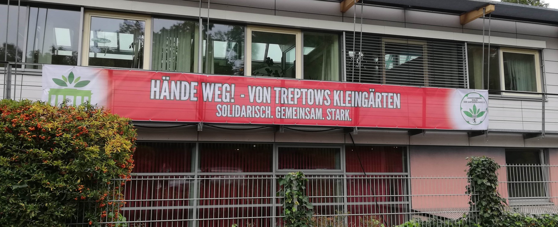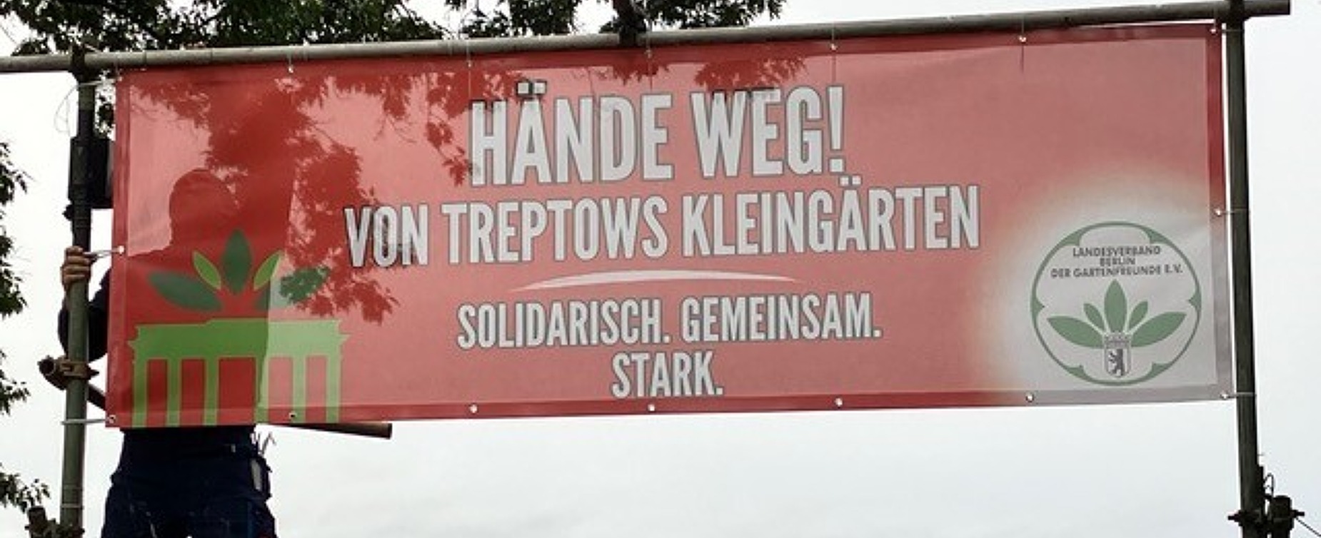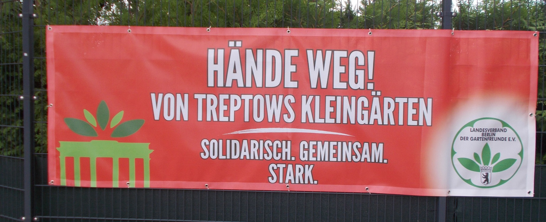 Der Landesverband dankt im Namen der betroffenen Gartenfreunde in Treptow-Späthsfelde allen Banner-Akteuren für die öffentlich gezeigte Solidarität ihres Vereins: Tausend Dank in die Bezirke! Leserinnen und Leser seien hier gewiss: es hängen mehr rote Banner in Berlin, als wir hier zeigen können.